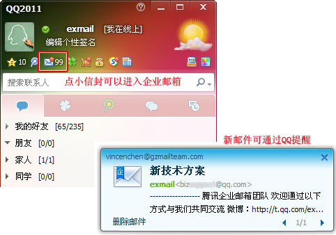 绑定QQ通过QQ面板一键登录,并可收到QQ即时消息提示有新邮件。